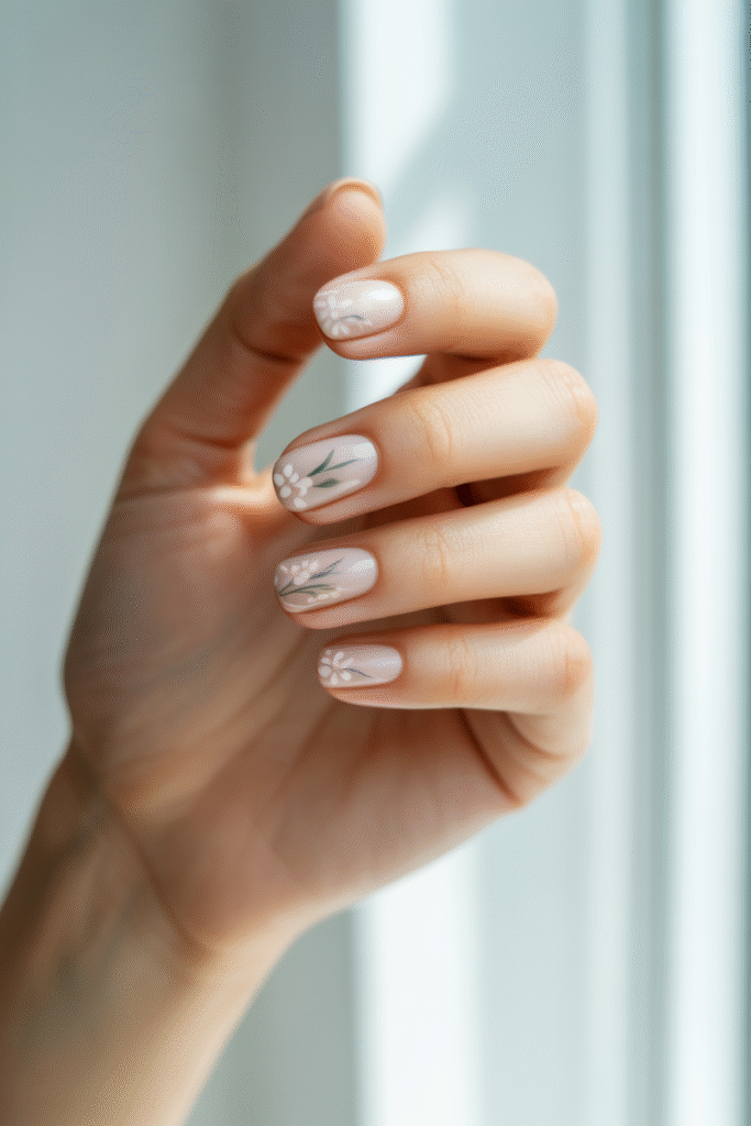 The nail design in the image features a soft nude pink base that gives the nails a natural, clean, and elegant look. This base color is perfect for creating a subtle and feminine appearance while allowing the artwork to stand out beautifully. The design includes minimal white floral patterns combined with thin green leaf strokes, giving the nails a delicate botanical vibe.
